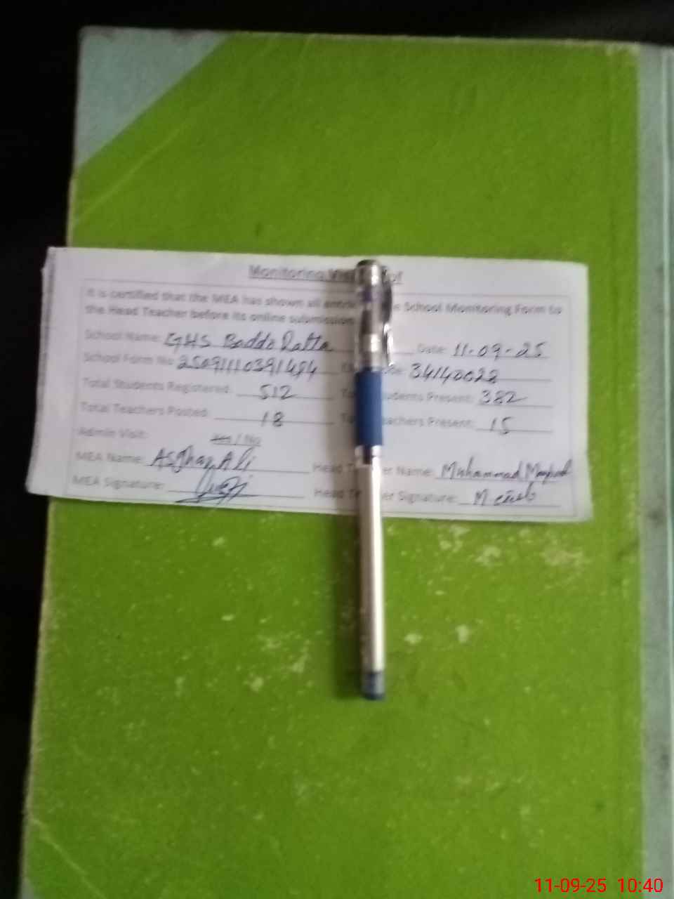 | Certified that this School was Inspected by the Undersigned MEA/DMO Today and the Information Stated Above is as Per Record. | |||||