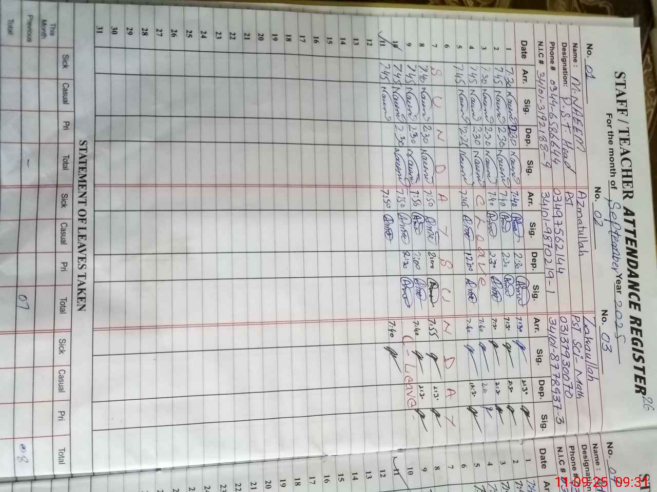 | CNIC | Full Name | Designation | R/C | Absence during last cal. month |