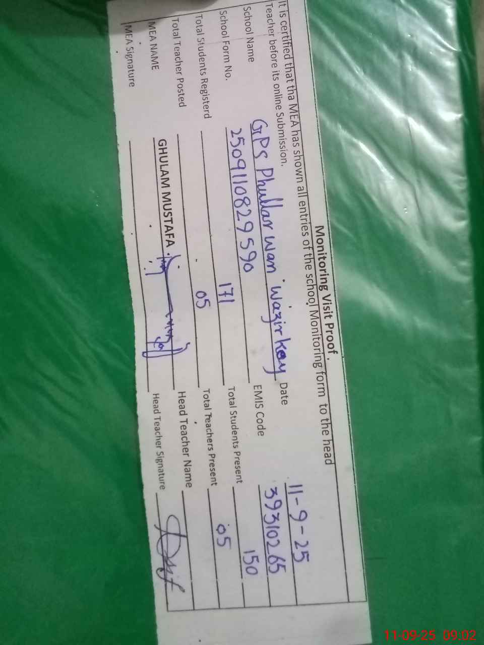 | Attendance Register | Head Teacher | MEA with School | Visit Proof |