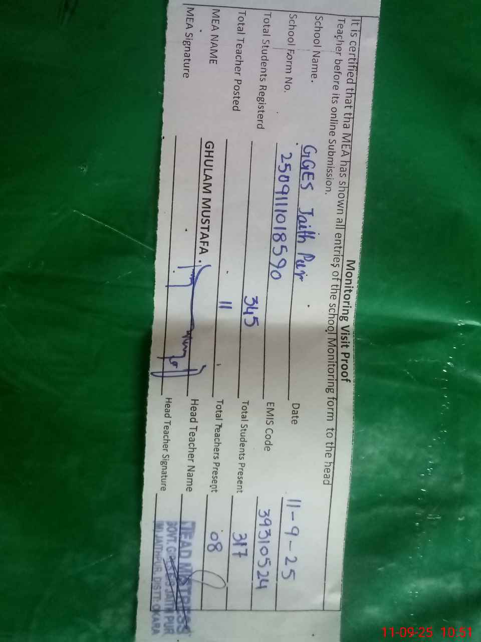 | Attendance Register | Head Teacher | MEA with School | Visit Proof |