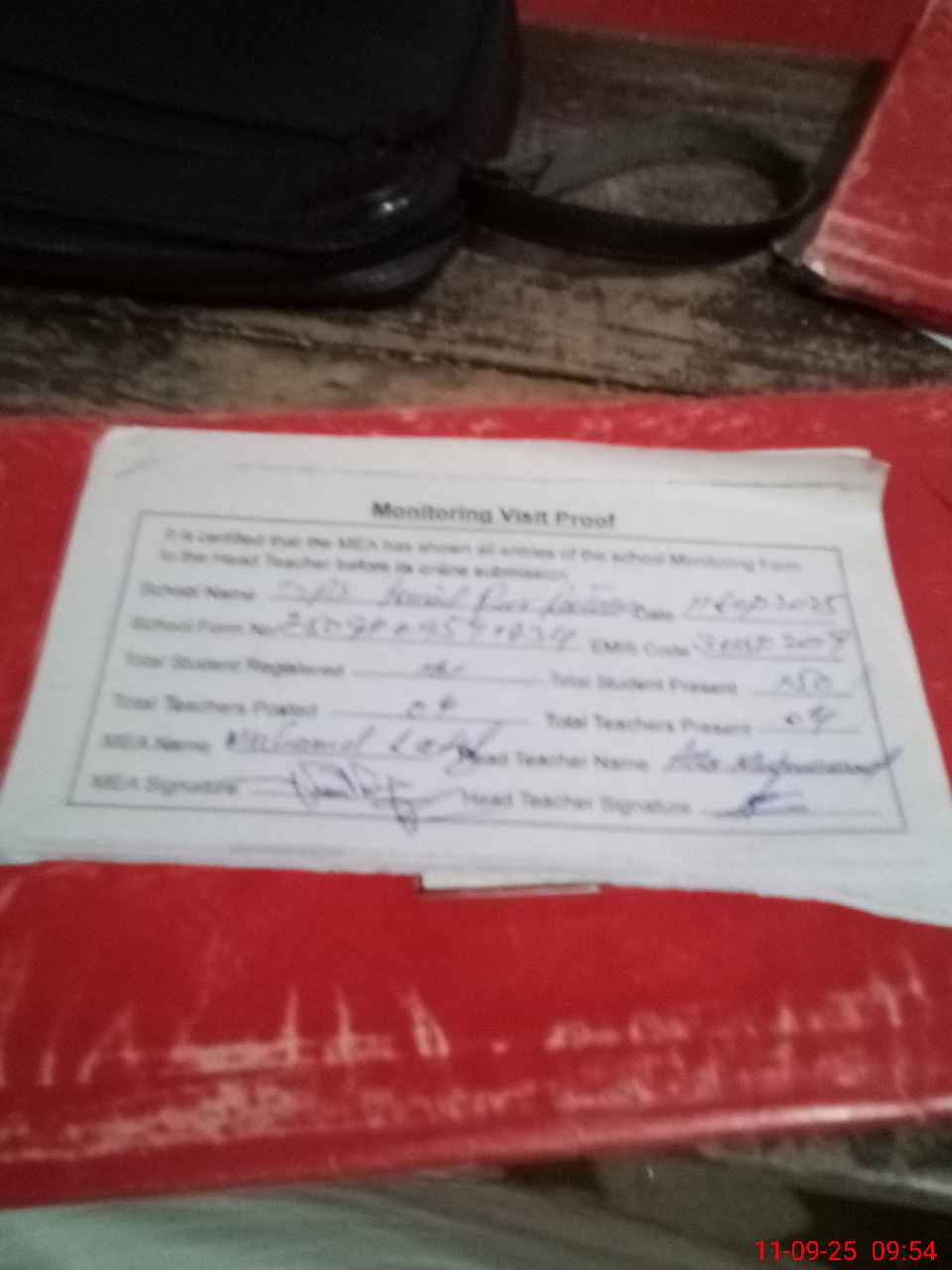 | Attendance Register | Head Teacher | MEA with School | Visit Proof |