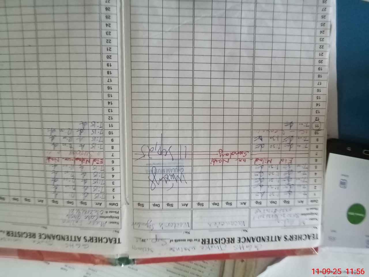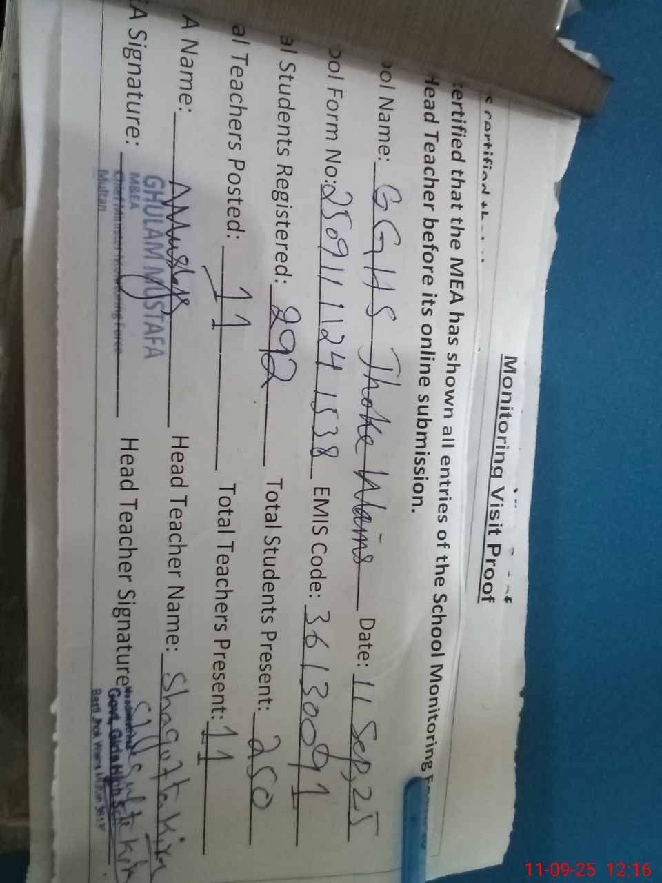 | Attendance Register | Head Teacher | MEA with School | Visit Proof |