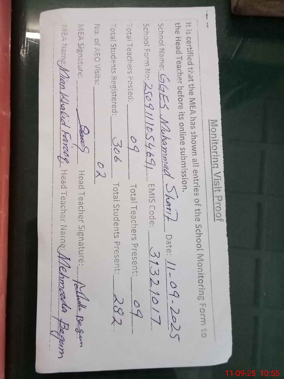 | Attendance Register | Head Teacher | MEA with School | Visit Proof |