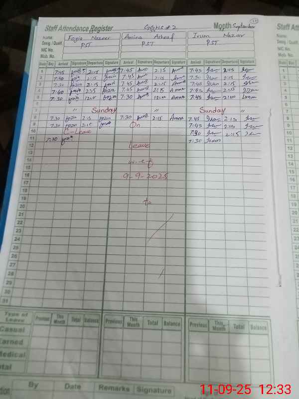 | CNIC | Full Name | Designation | R/C | Absence During Last Calender Month |