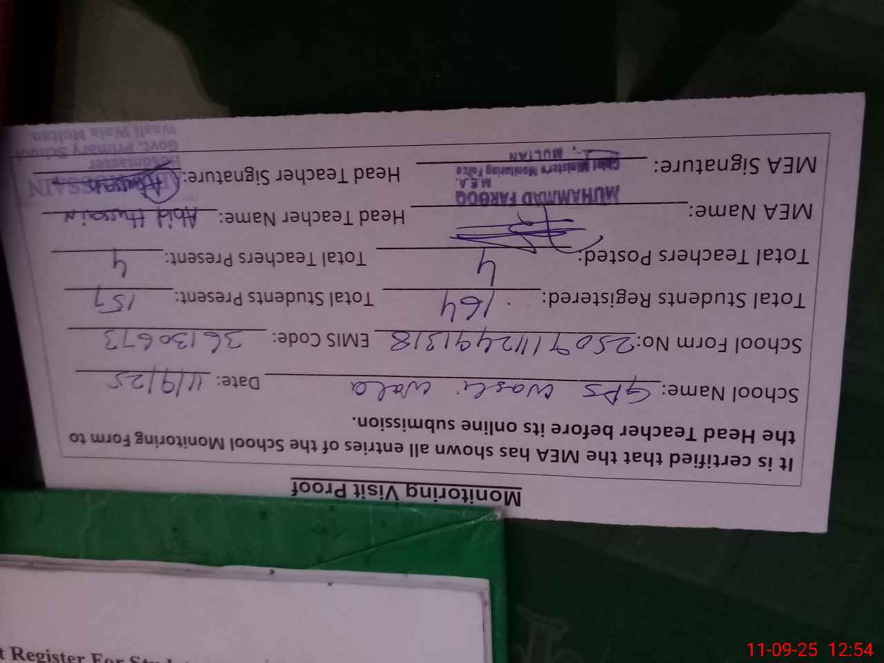 | Attendance Register | Head Teacher | MEA with School | Visit Proof |