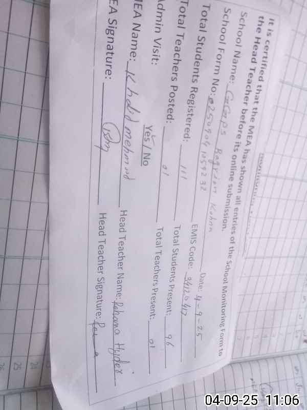 | Attendance Register | Head Teacher | MEA with School | Visit Proof |