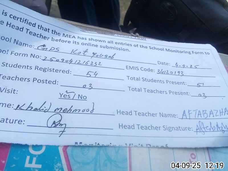| EMIS Code: 34120193 | Name of School: GPS KOT YOUSAF | |||