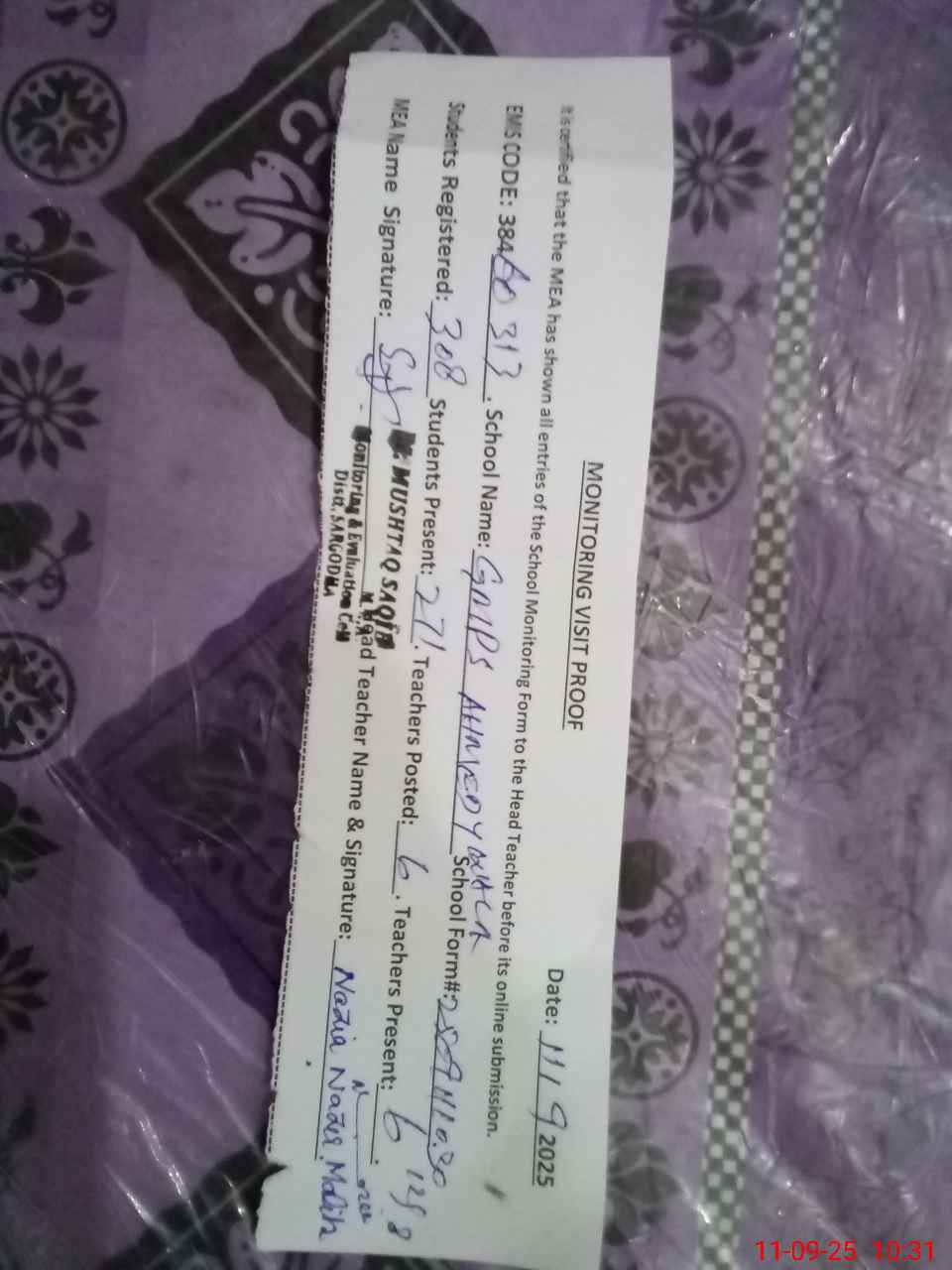 | Attendance Register | Head Teacher | MEA with School | Visit Proof |