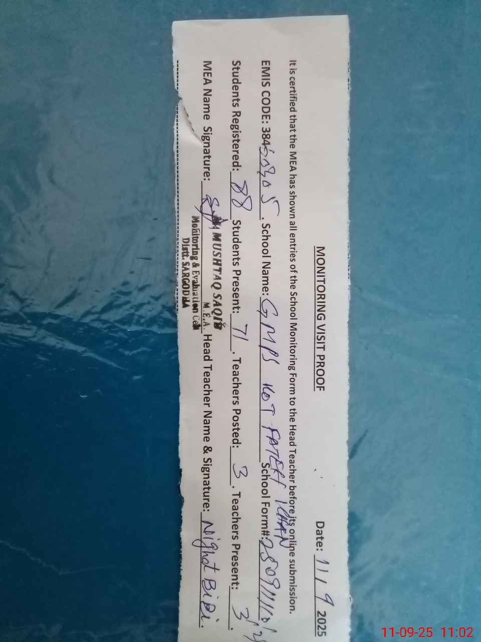 | Attendance Register | Head Teacher | MEA with School | Visit Proof |