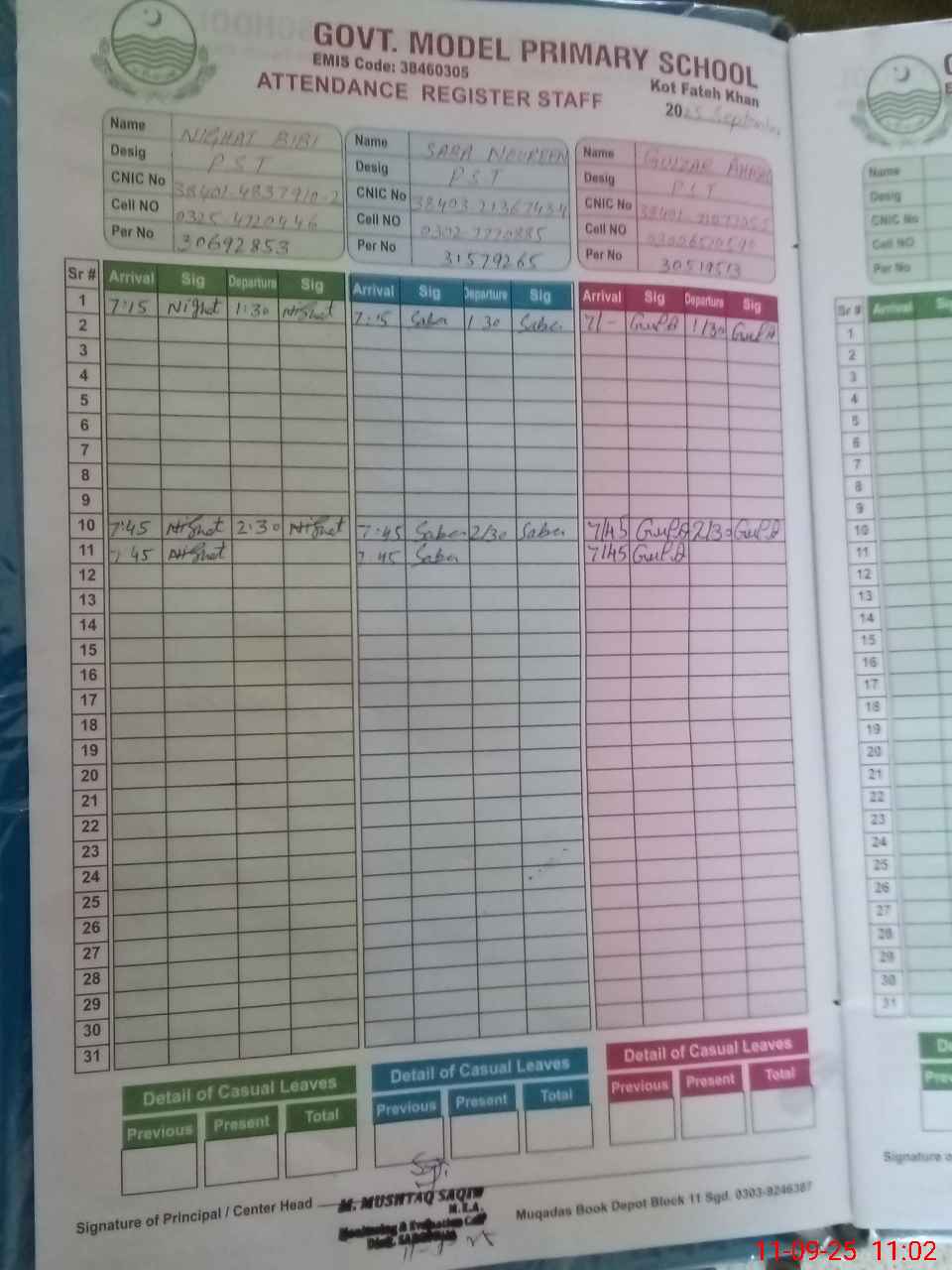 | Name: NI**** BI**** Designation: (School Headmaster's/Headmistress's) PST Phone/Cell Number: 03**** |