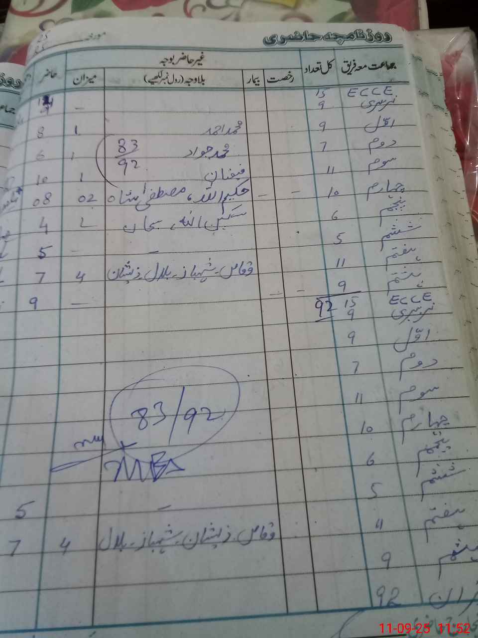 | No. of Students Present - Male | 14 | 0 | 9 | 8 | 6 | 10 | 9 | 5 | 5 | 8 | 9 | 83 | ||||