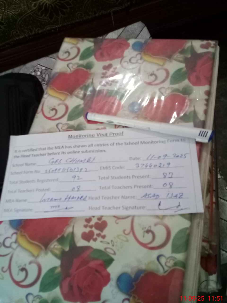 | Attendance Register | Head Teacher | MEA with School | Visit Proof |