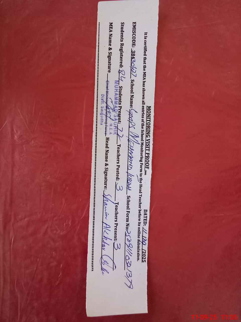 | Monitoring Date: 11-09-2025 | Start Time: 11-09-2025 10:32 AM | End Time: 11-09-2025 11:06 AM | Name of MEA: MU**** SA**** | |