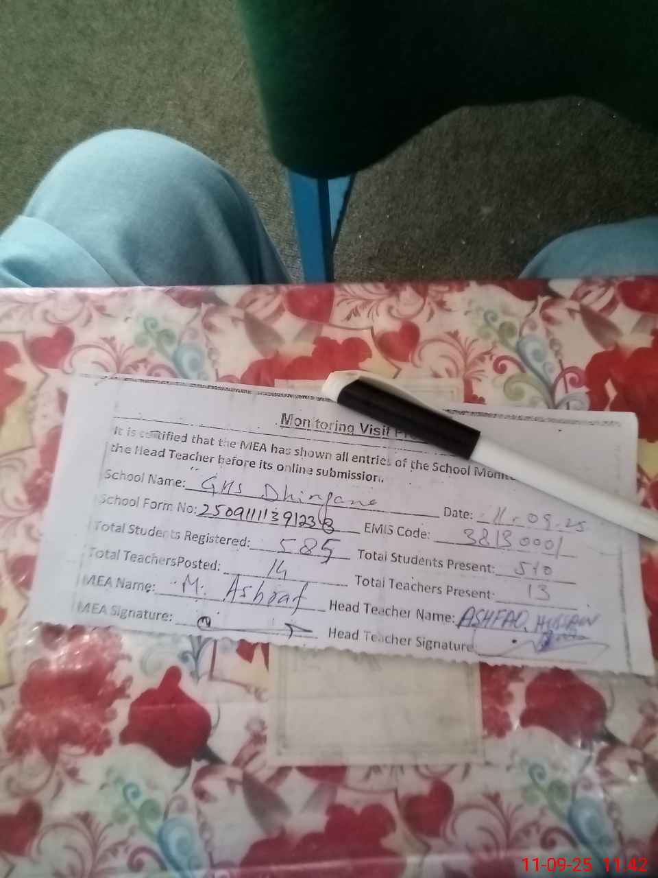 | Attendance Register | Head Teacher | MEA with School | Visit Proof |