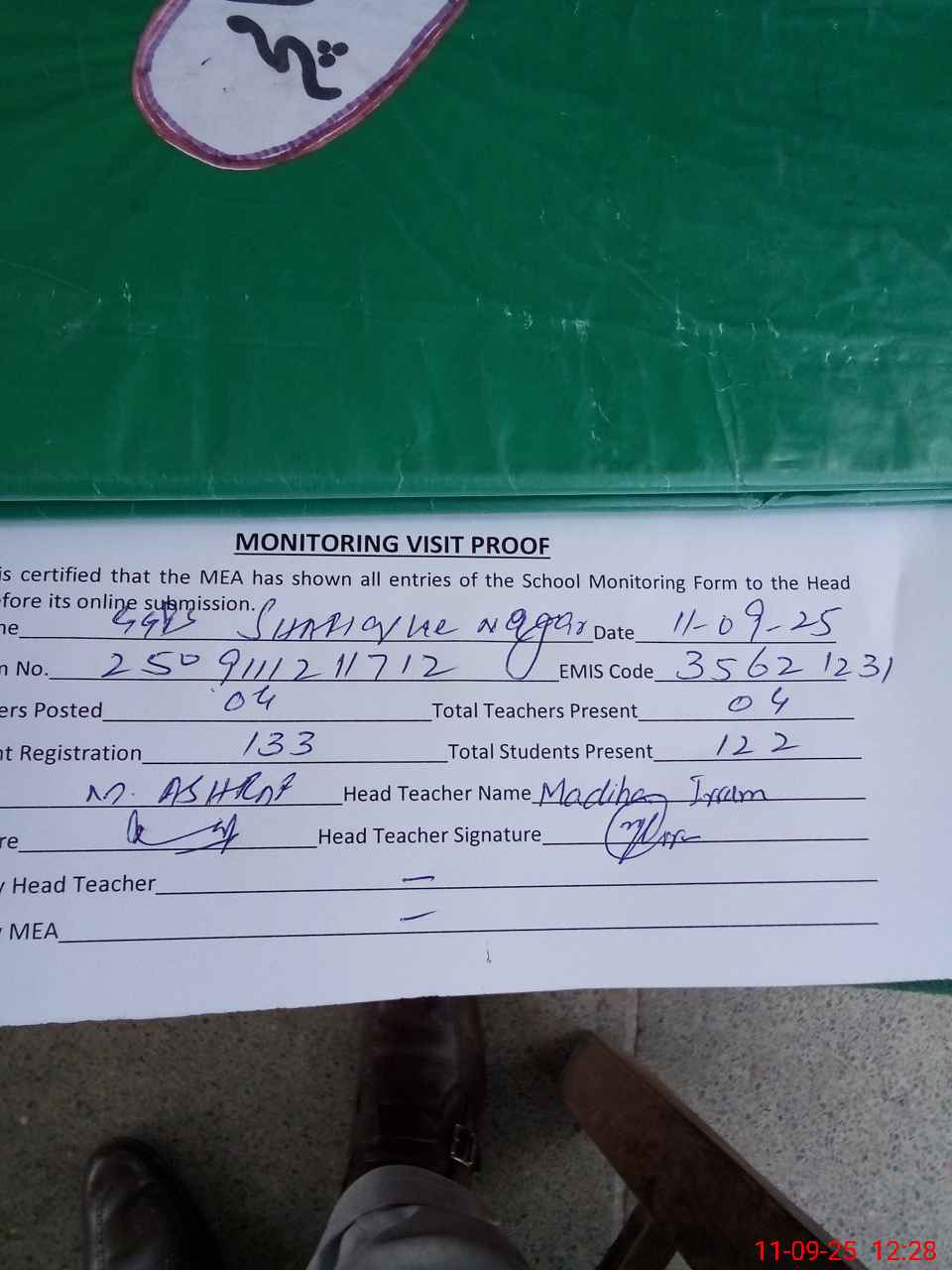 | Attendance Register | Head Teacher | MEA with School | Visit Proof |