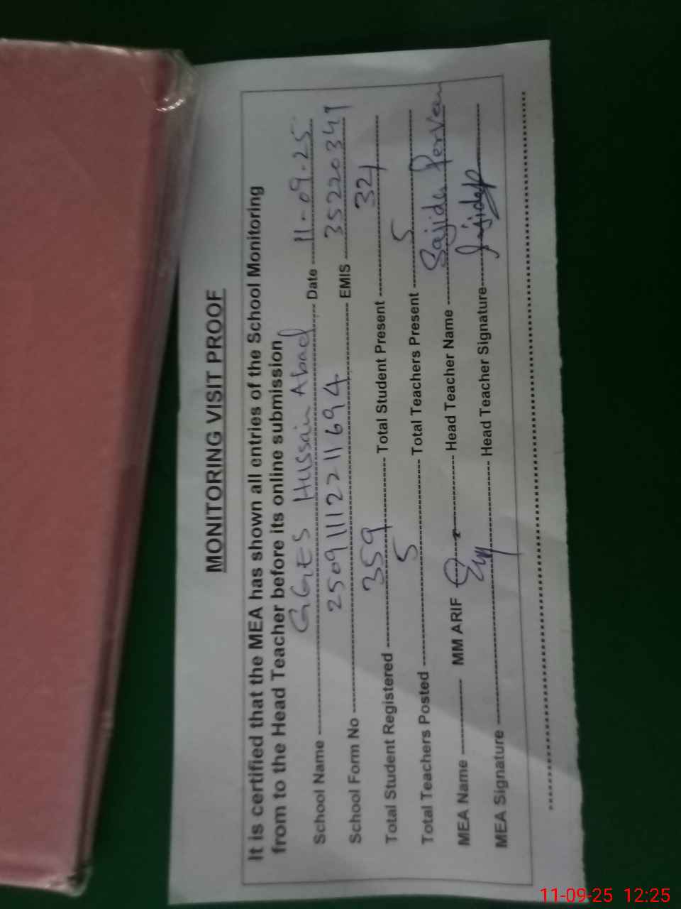 | Attendance Register | Head Teacher | MEA with School | Visit Proof |