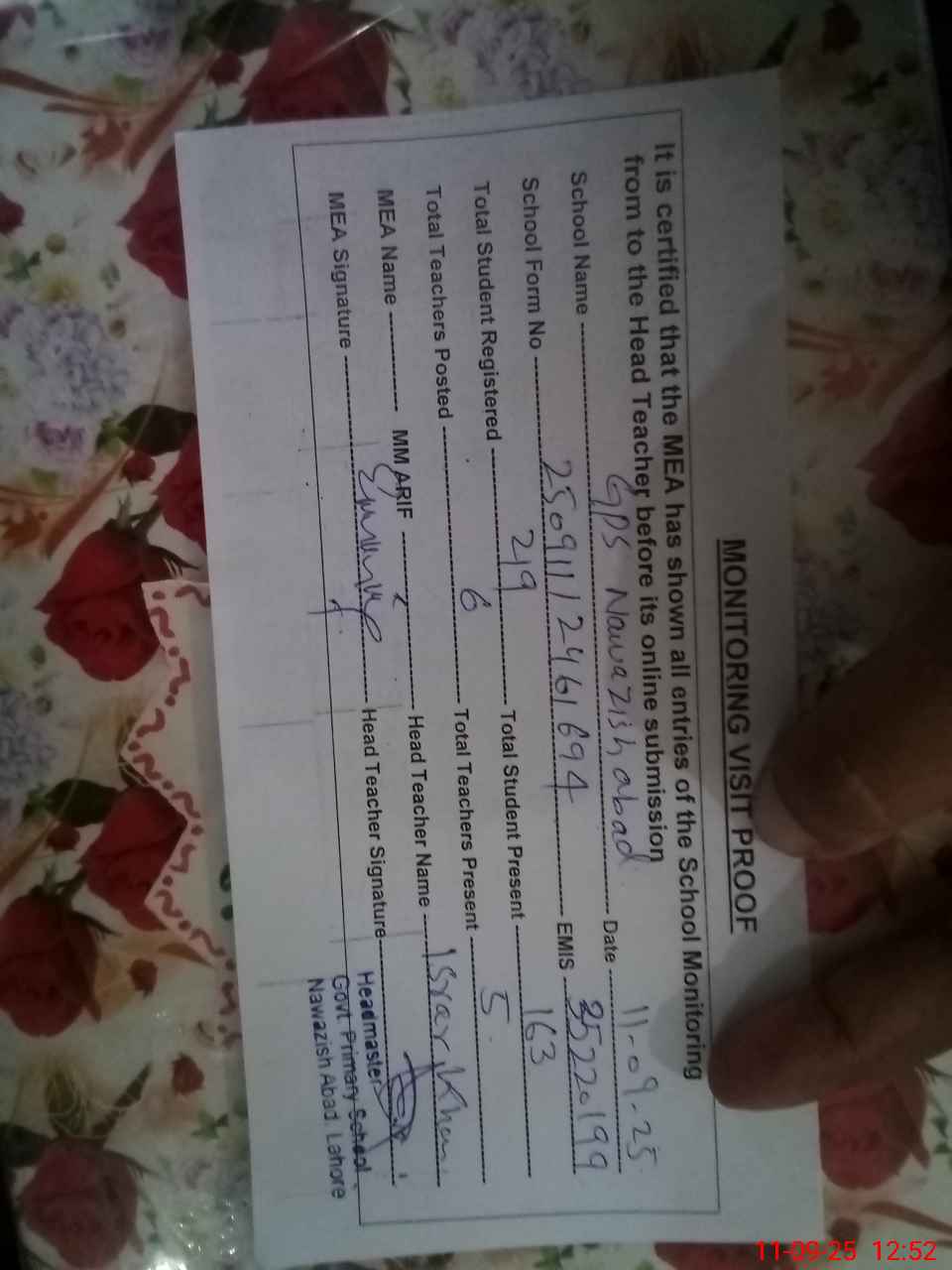| EMIS Code: 35220199 | Name of School: GPS NAWAZISH ABAD RAIWIND ROAD | |||