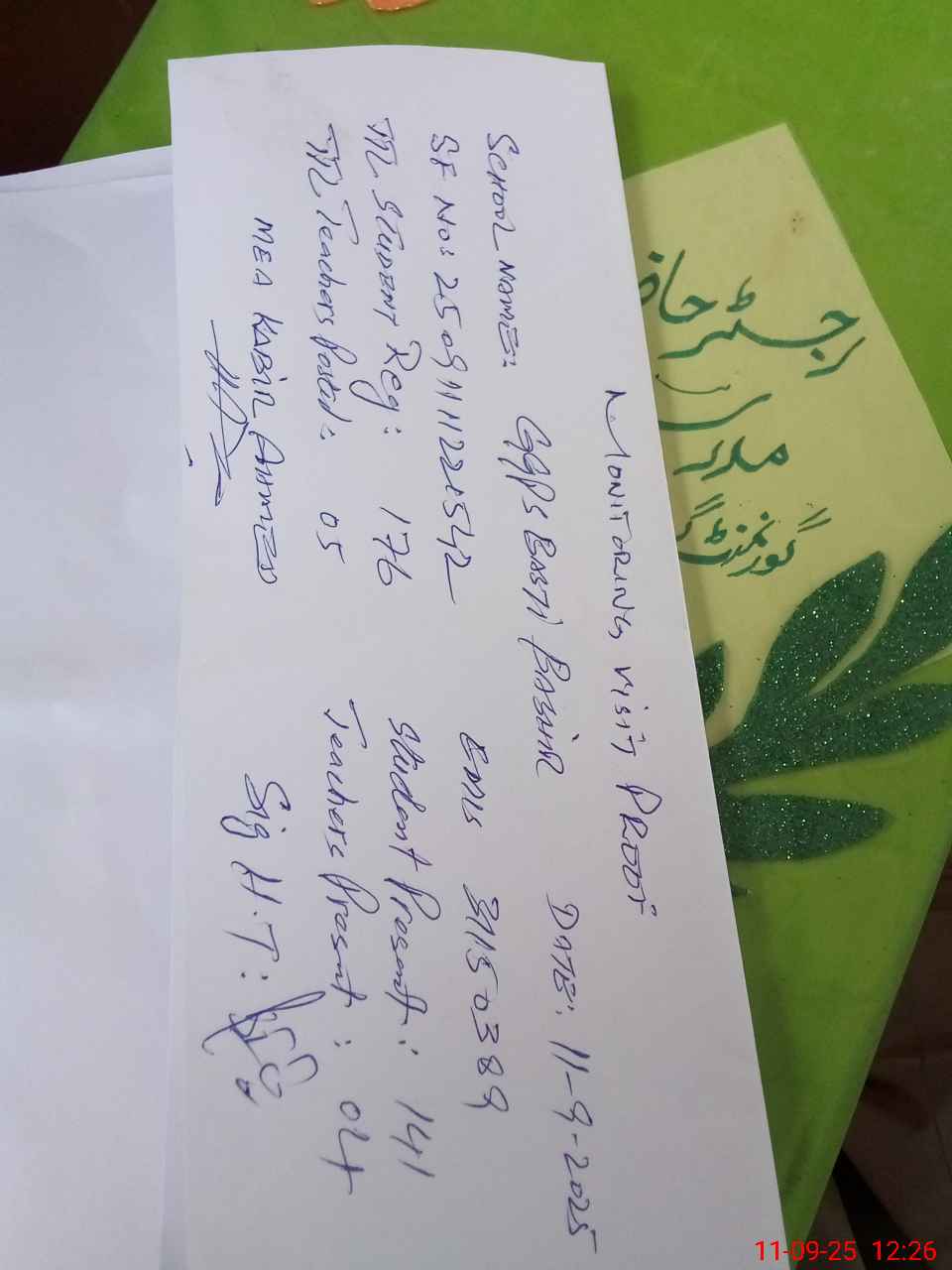 | Attendance Register | Head Teacher | MEA with School | Visit Proof |