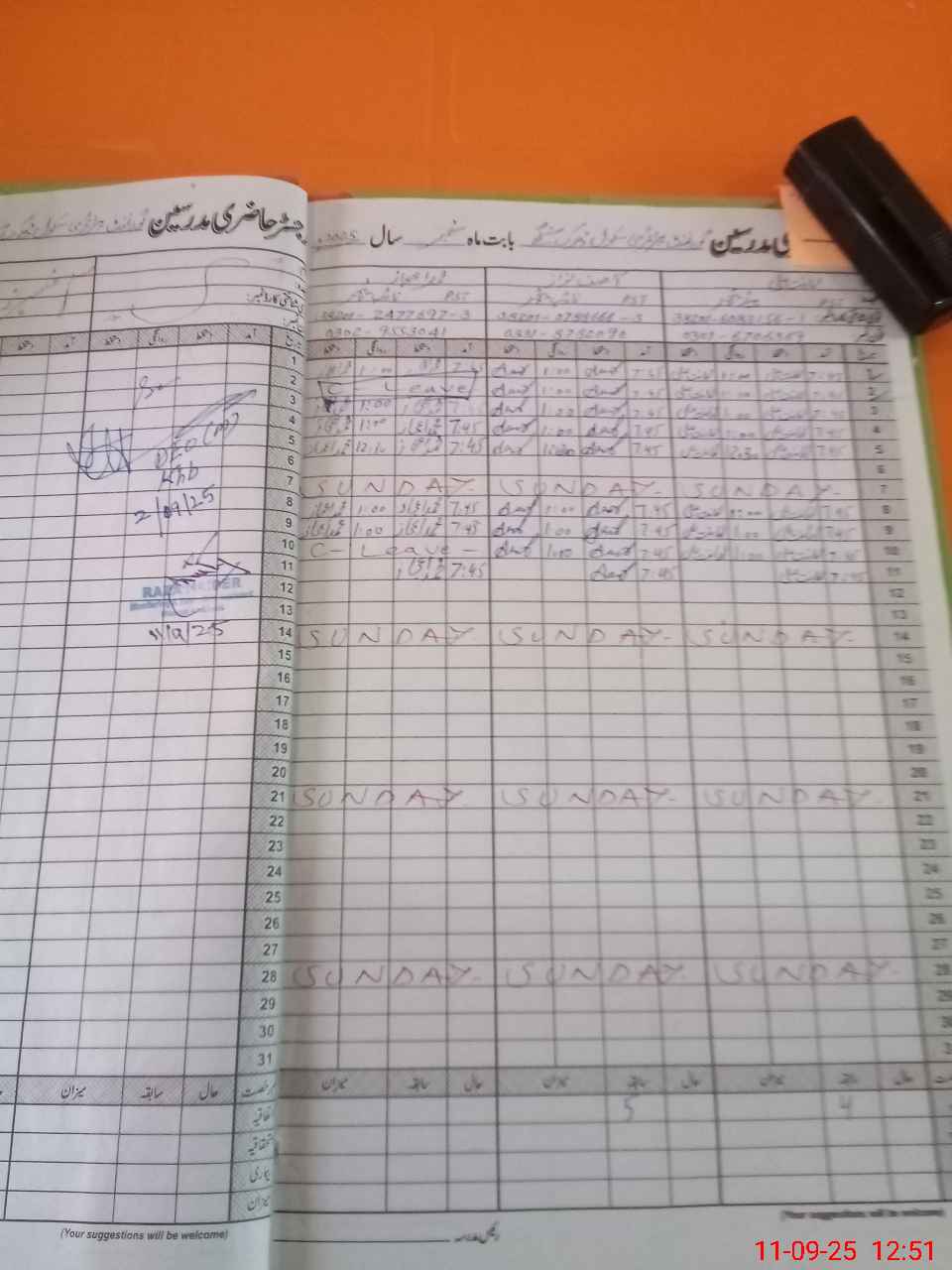 | CNIC | Full Name | Designation | R/C | Absence During Last Calender Month |