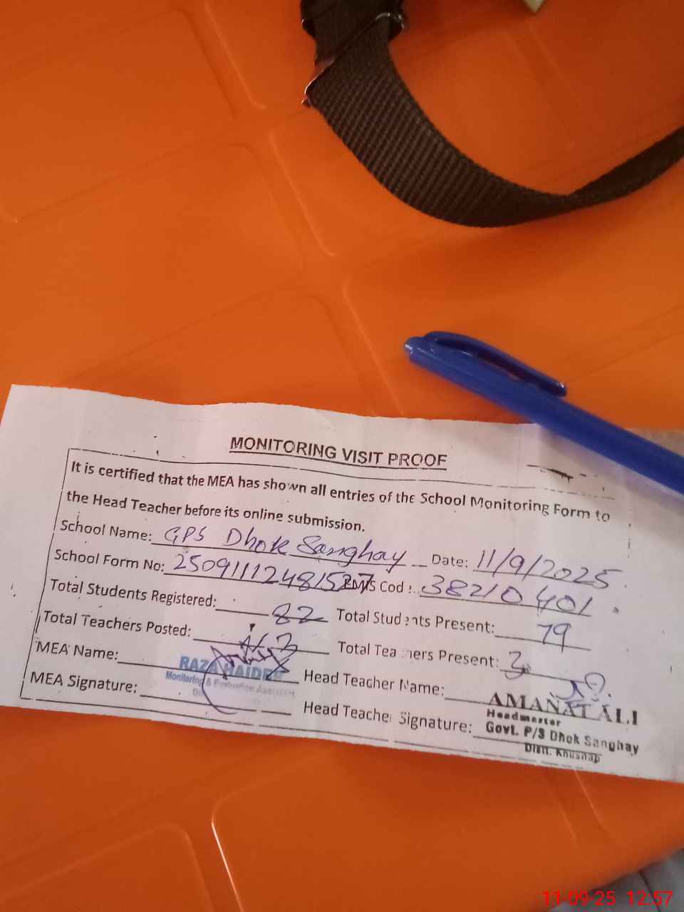 | Attendance Register | Head Teacher | MEA with School | Visit Proof |