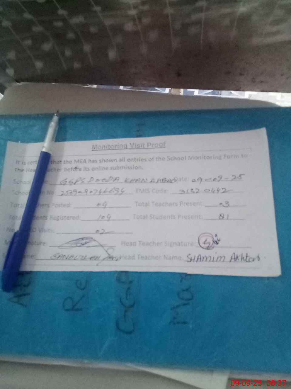 | Attendance Register | Head Teacher | MEA with School | Visit Proof |