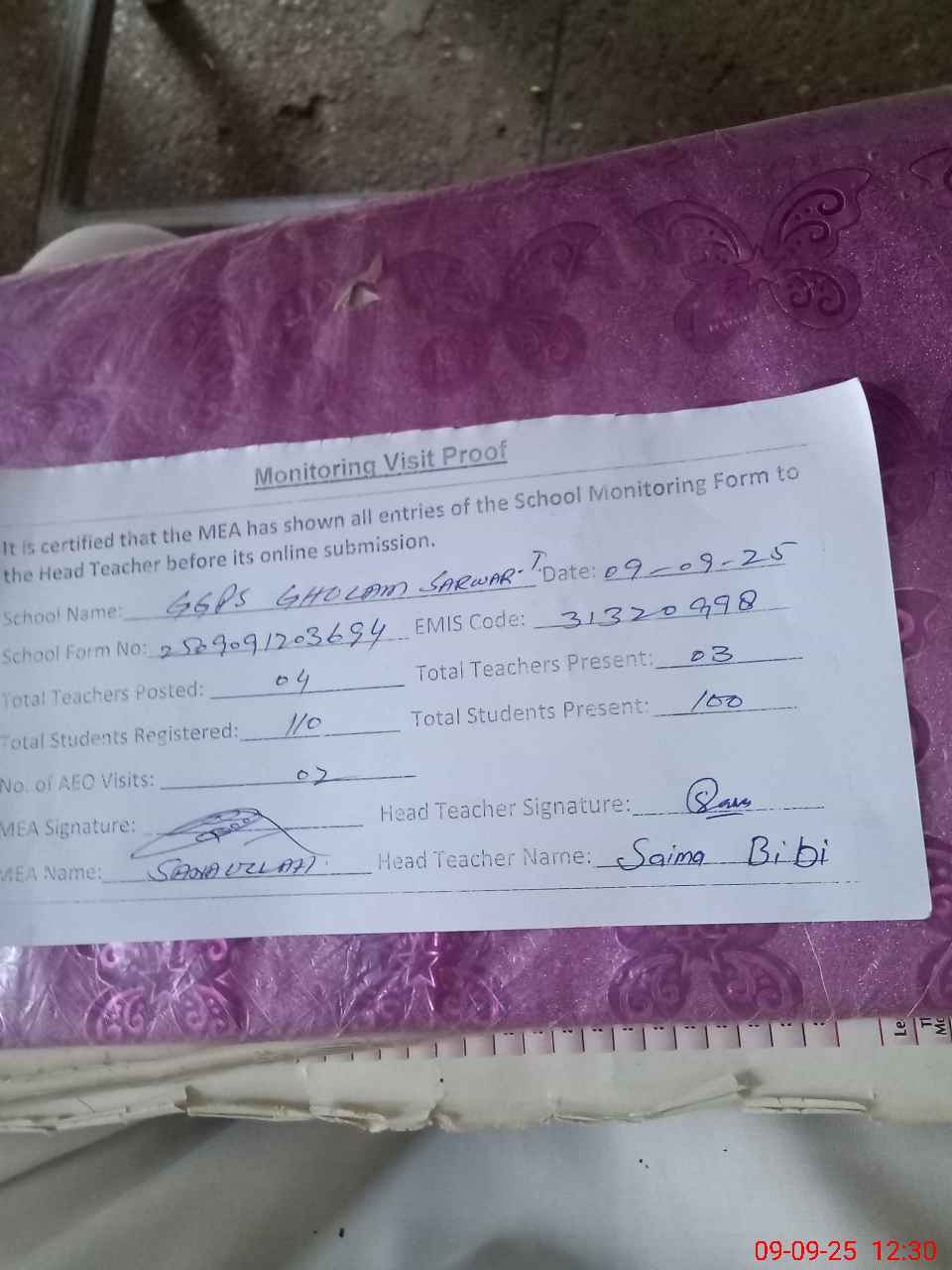 | Attendance Register | Head Teacher | MEA with School | Visit Proof |
