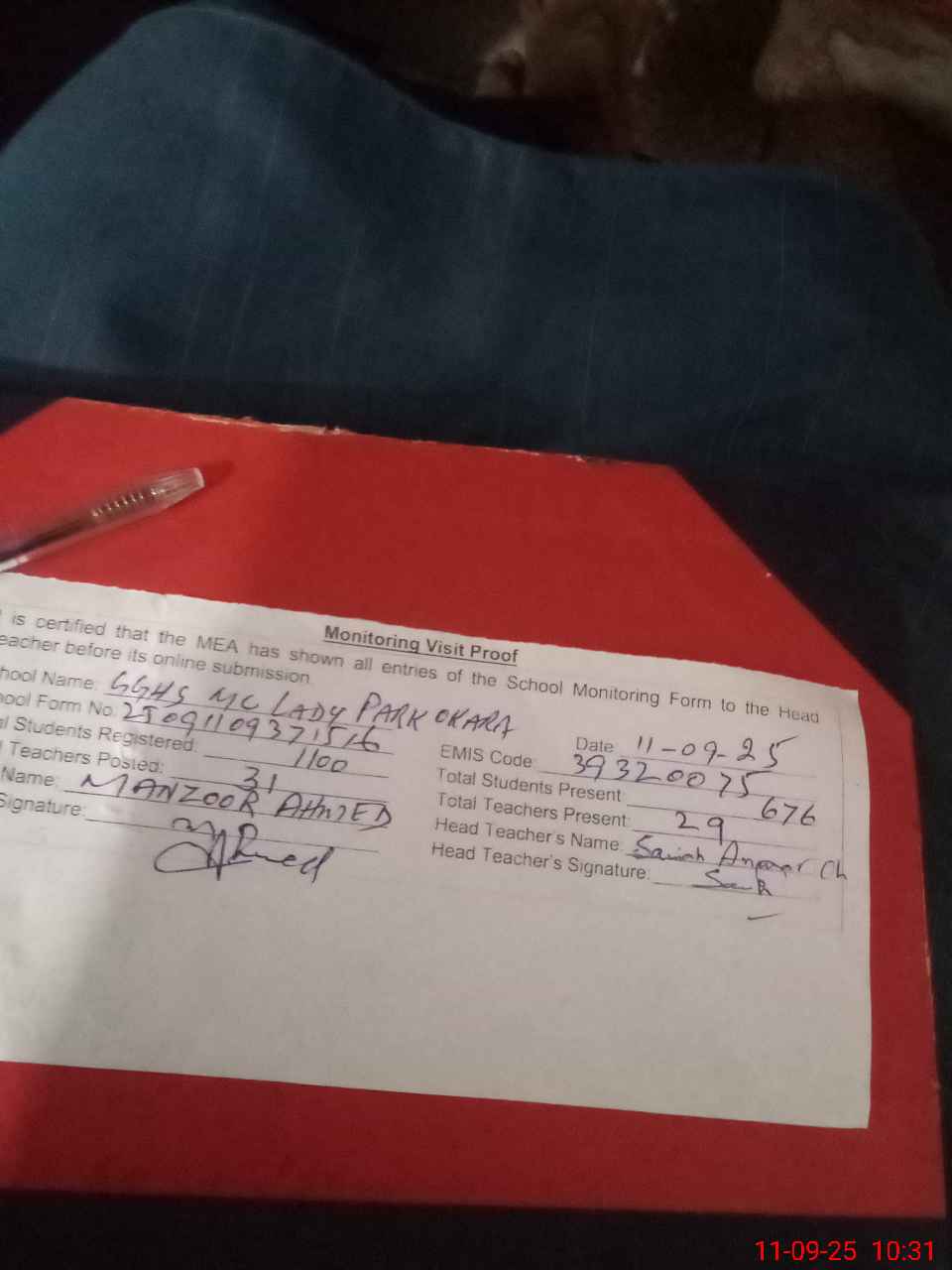 | EMIS Code: 39320075 | Name of School: GGHS MC LADY PARK OKARA | |||