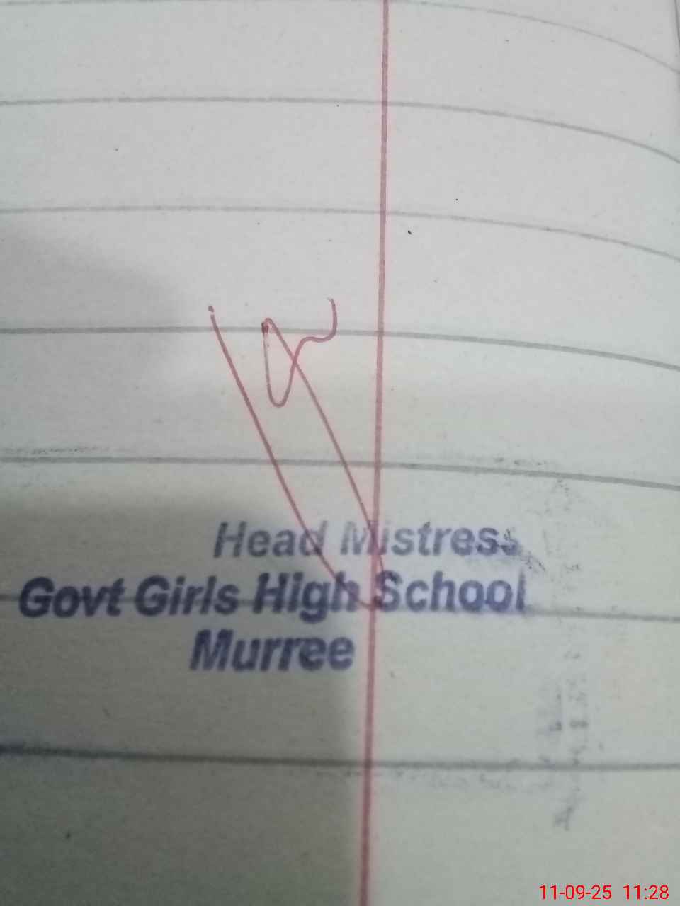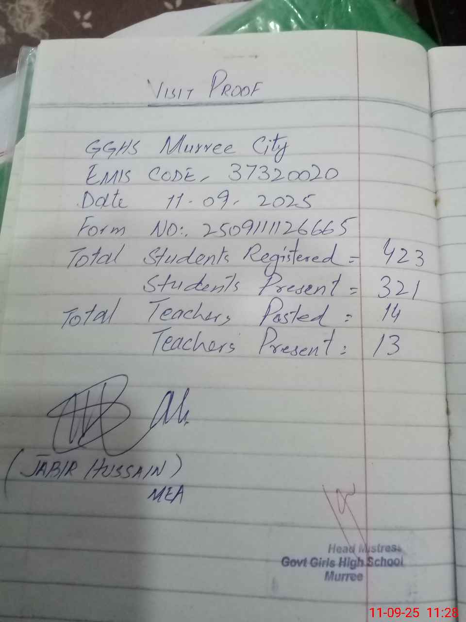 | Total no. of Classrooms: 16 No. of Classrooms Used for Teaching: 13 No. of Classrooms Storing Old Furniture, FTBs, etc: 0Comments if Any: One non teaching staff name Umer khan Jnr Clk on official duty in CEO office Murree Random class check list not updated in pmiu application given list for check class upgrades and leave school |