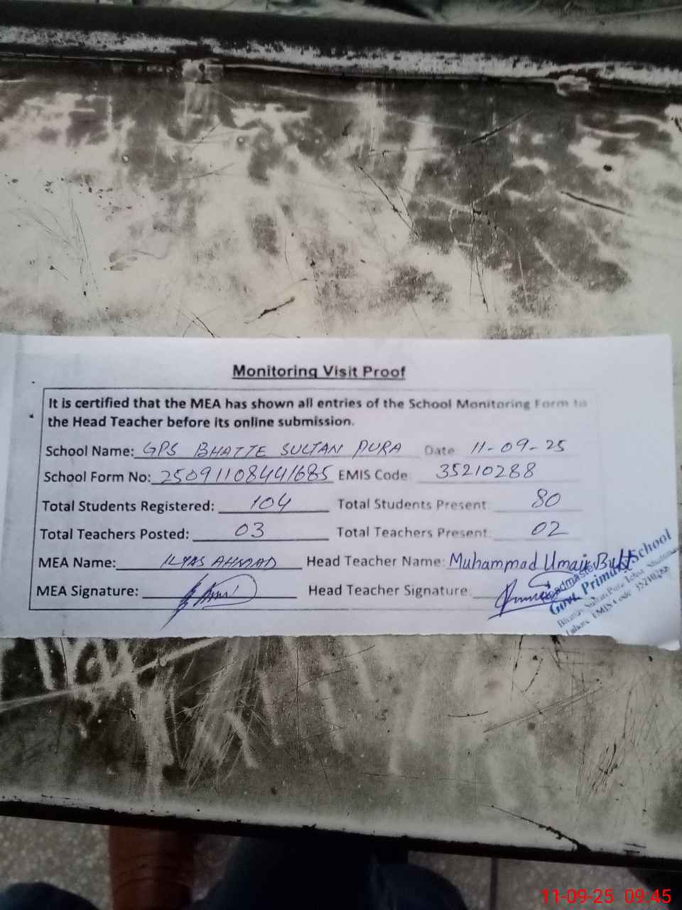 | EMIS Code: 35210288 | Name of School: GPS BHATTE SULTAN PURA | |||