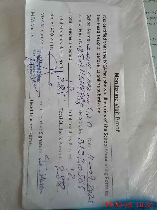 | Attendance Register | Head Teacher | MEA with School | Visit Proof |