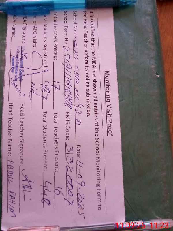 | Attendance Register | Head Teacher | MEA with School | Visit Proof |