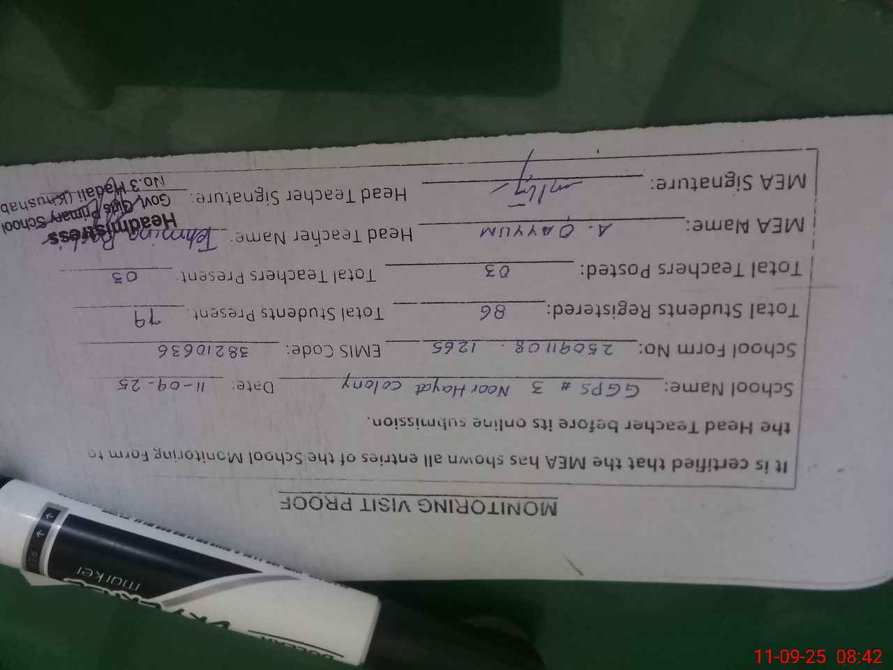 | Attendance Register | Head Teacher | MEA with School | Visit Proof |