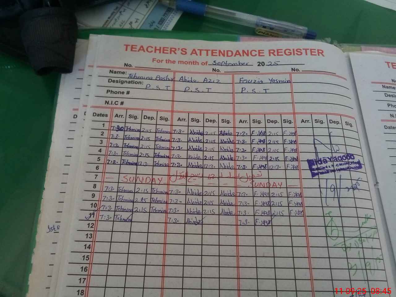 | CNIC | Full Name | Designation | R/C | Absence During Last Calender Month |