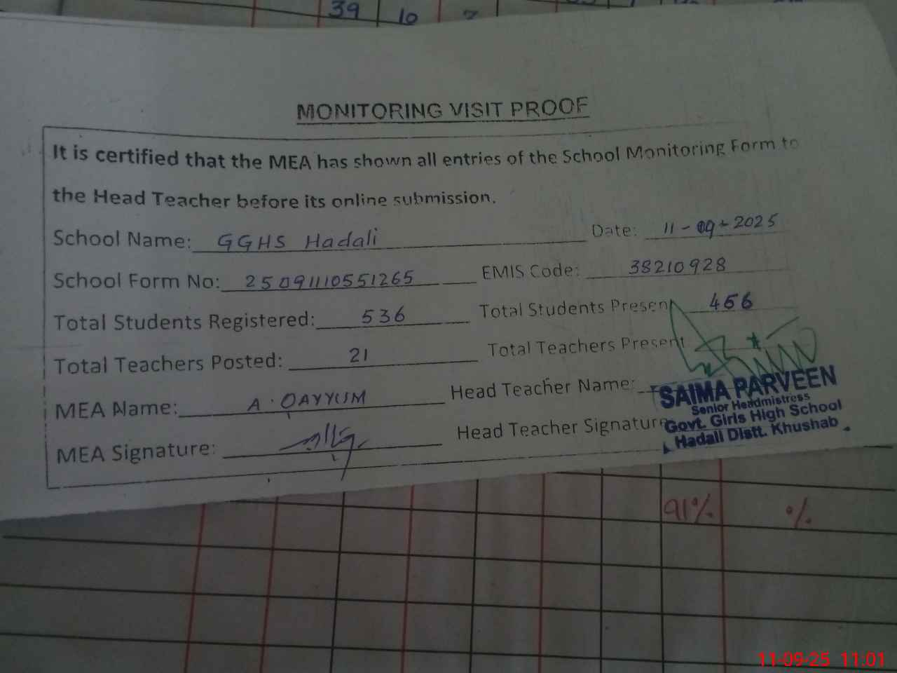 | Attendance Register | Head Teacher | MEA with School | Visit Proof |