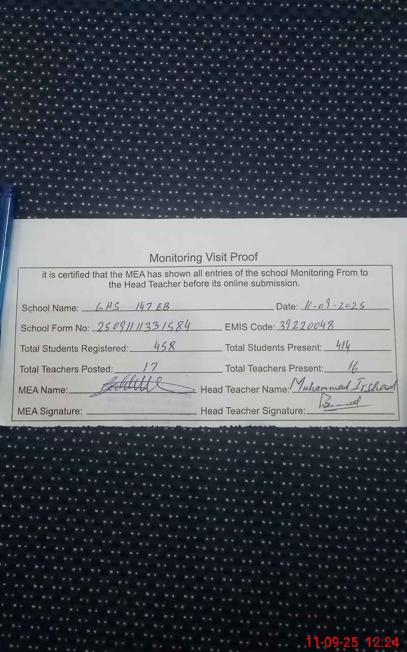 | EMIS Code: 39220048 | Name of School: GHS 147 EB | |||