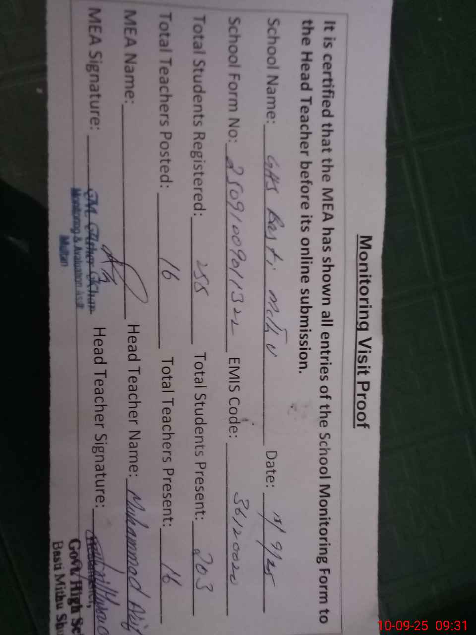 | Certified that this School was Inspected by the Undersigned MEA/DMO Today and the Information Stated Above is as Per Record. | |||||