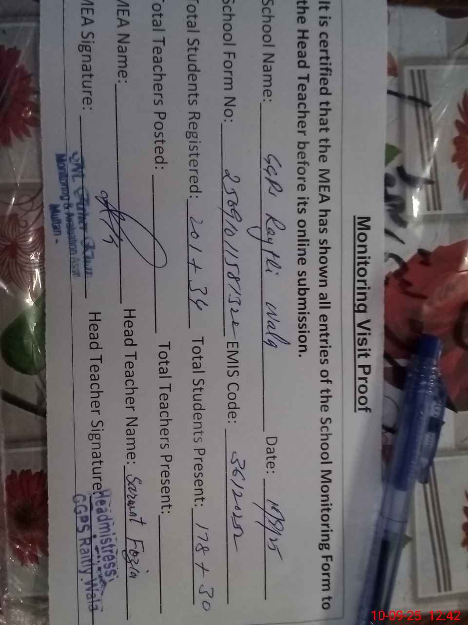 | Certified that this School was Inspected by the Undersigned MEA/DMO Today and the Information Stated Above is as Per Record. | |||||