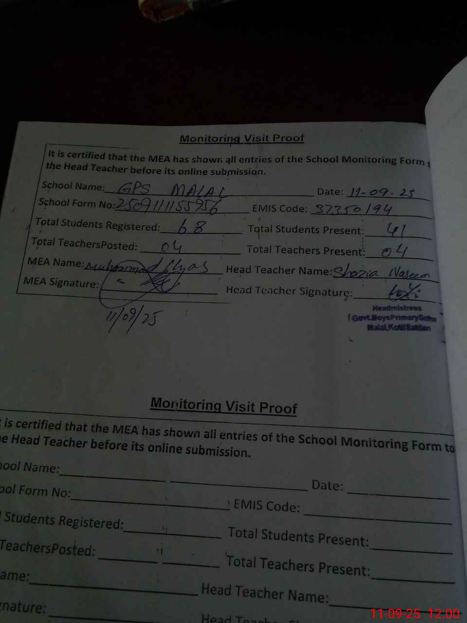 | Attendance Register | Head Teacher | MEA with School | Visit Proof |