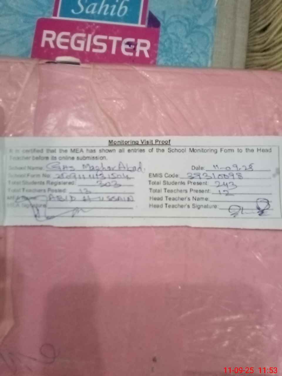 | Attendance Register | Head Teacher | MEA with School | Visit Proof |