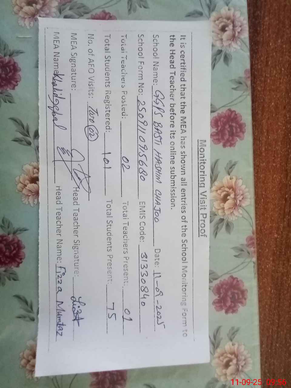 | Attendance Register | Head Teacher | MEA with School | Visit Proof |