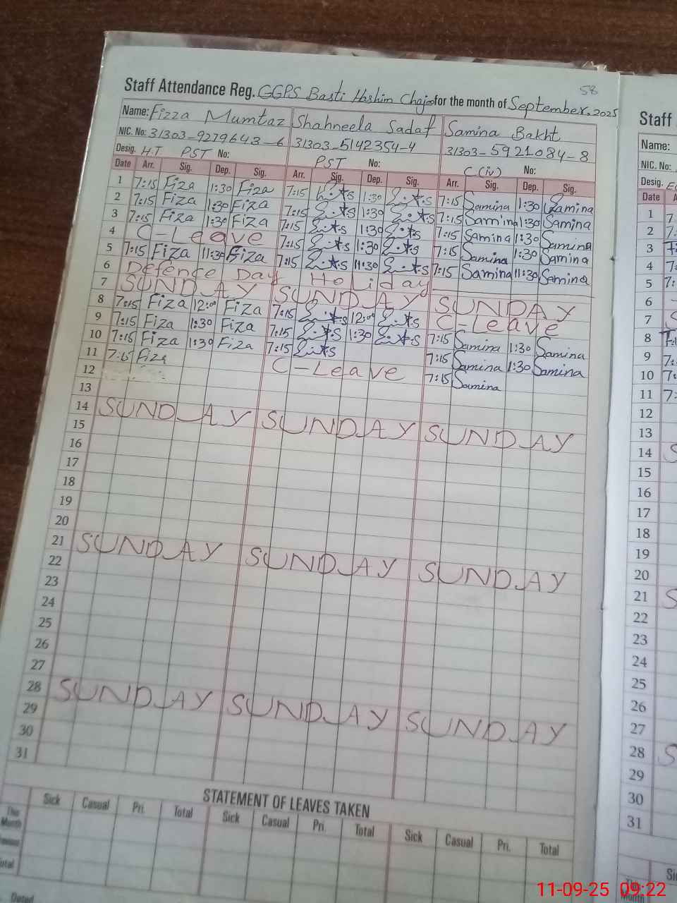 | CNIC | Full Name | Designation | R/C | Absence during last cal. month |