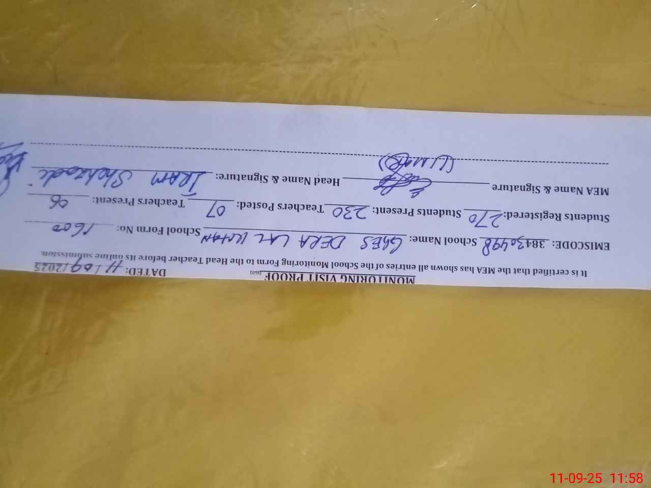 | Attendance Register | Head Teacher | MEA with School | Visit Proof |