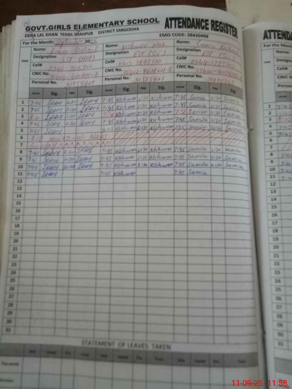 | Name: IR**** SH**** Designation: (School Headmaster's/Headmistress's) SST Phone/Cell Number: 03**** |