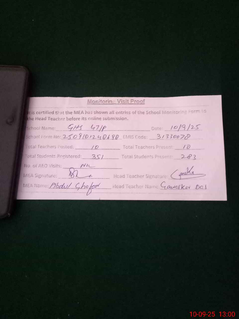 | Attendance Register | Head Teacher | MEA with School | Visit Proof |