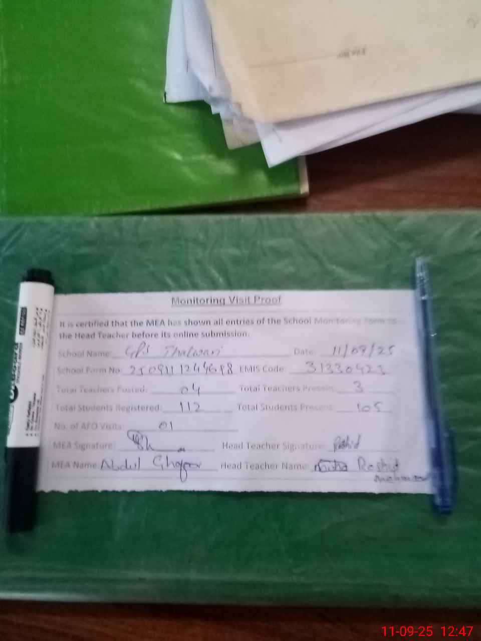 | Attendance Register | Head Teacher | MEA with School | Visit Proof |
