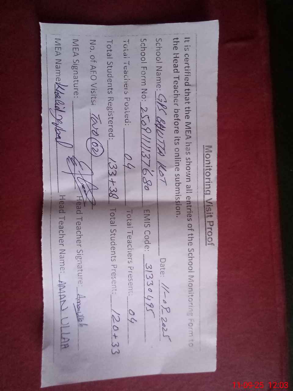 | Remarks (Use Separate Page if Required): Class redum verification not updated on mea tab as per sis and three classes are sitting on open air and school has insaf afternoon classes with students strength 38 | |||||