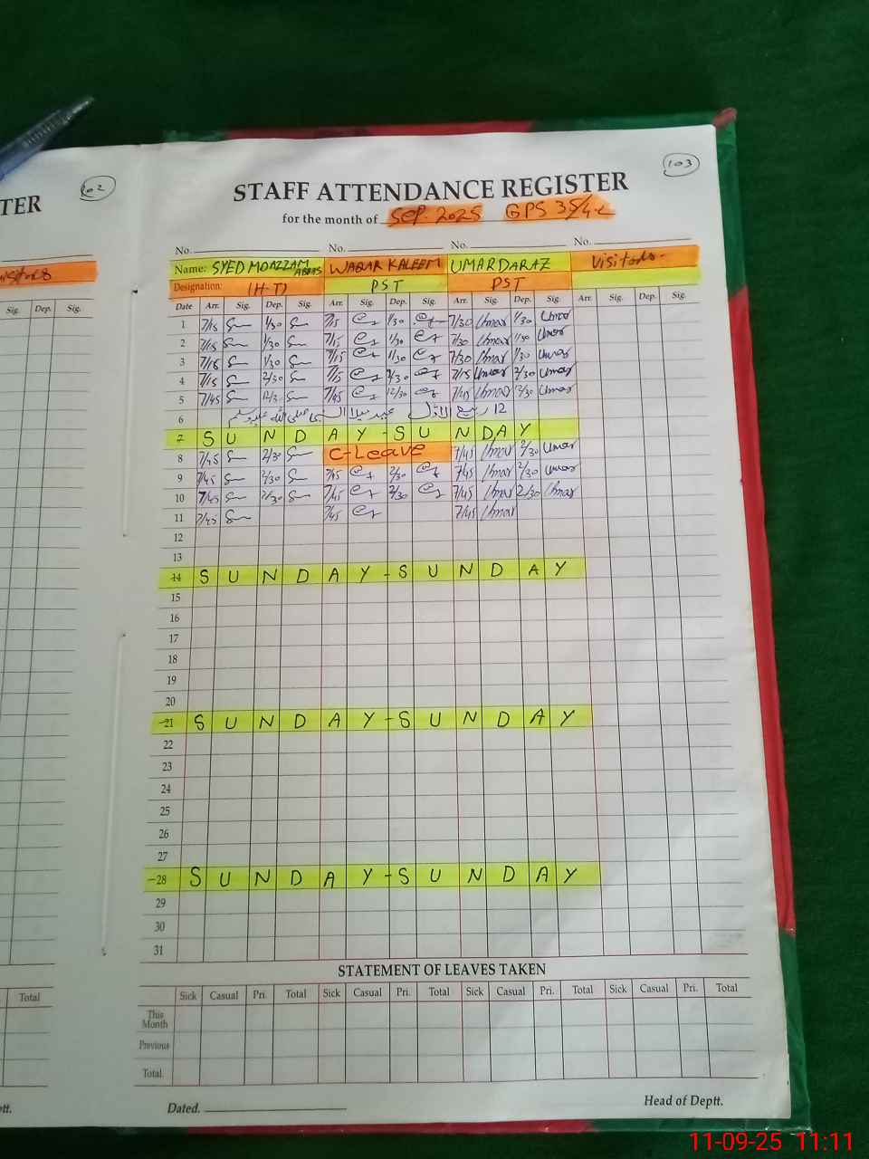 | Leave | Duty | Absent | Maternity | Medical | Ex- Pak |
