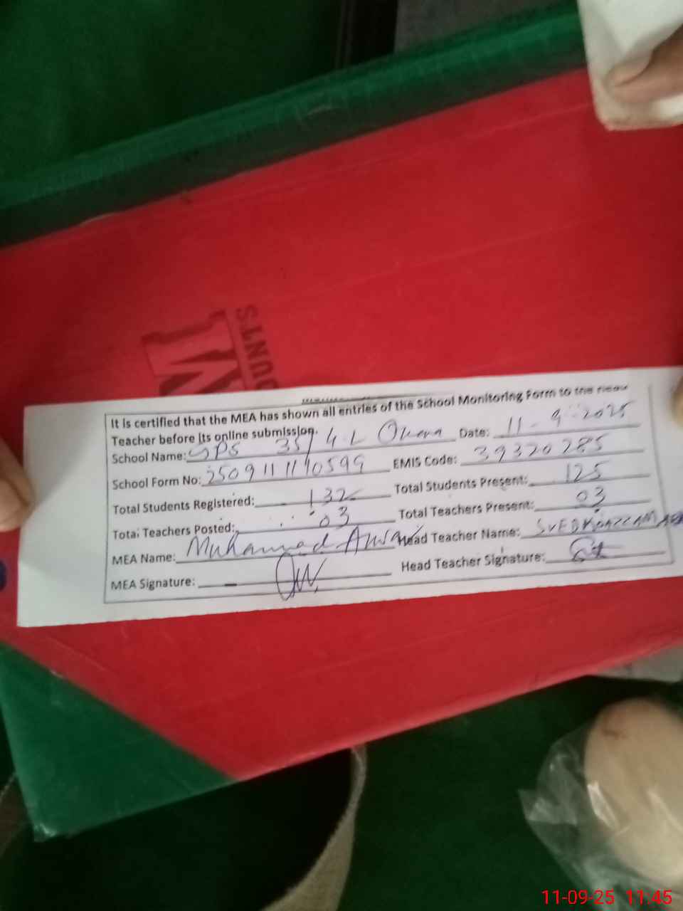 | Attendance Register | Head Teacher | MEA with School | Visit Proof |