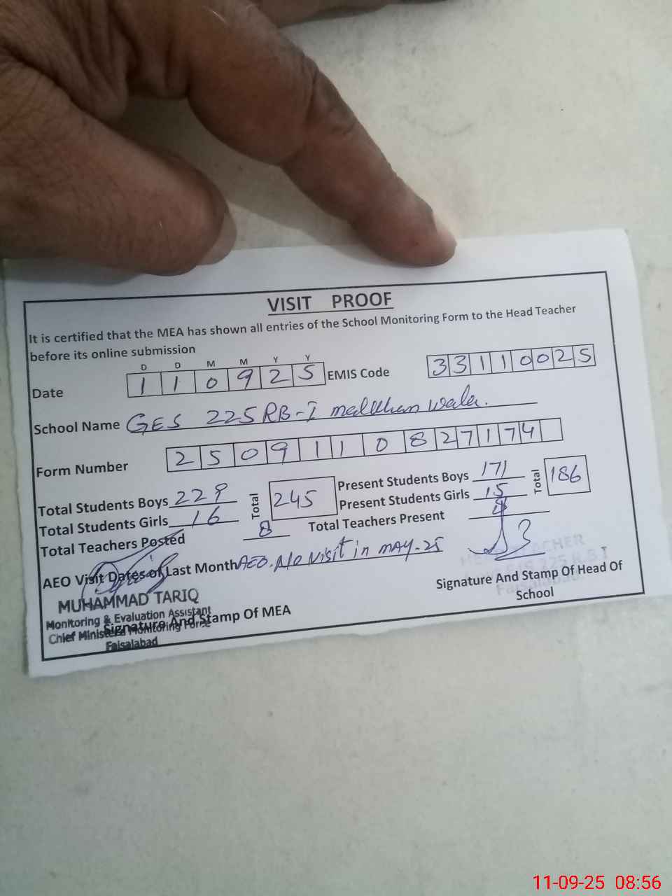 | EMIS Code: 33110025 | Name of School: GES 225 RB I MALKHAH WALA FSD | |||