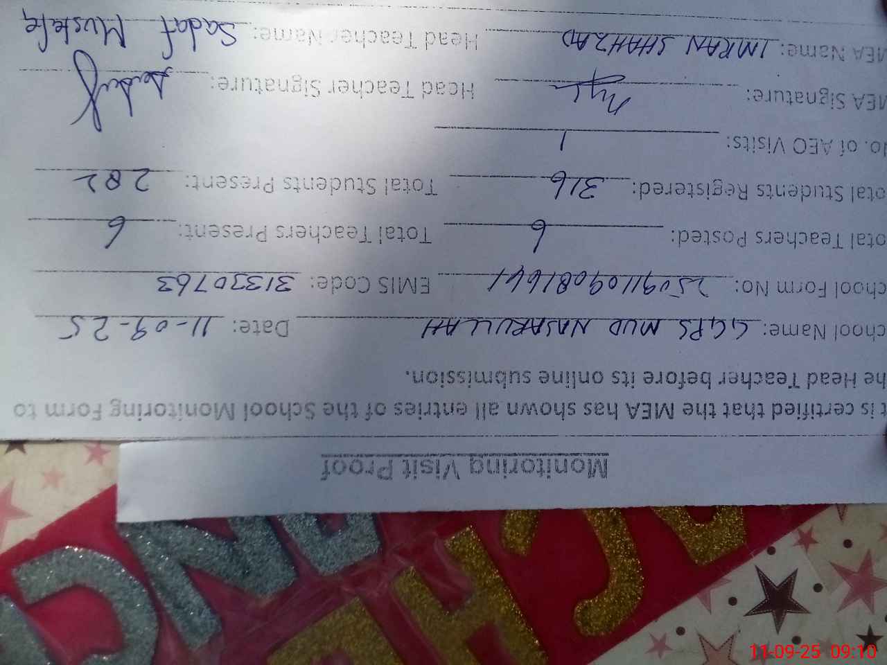 | Attendance Register | Head Teacher | MEA with School | Visit Proof |